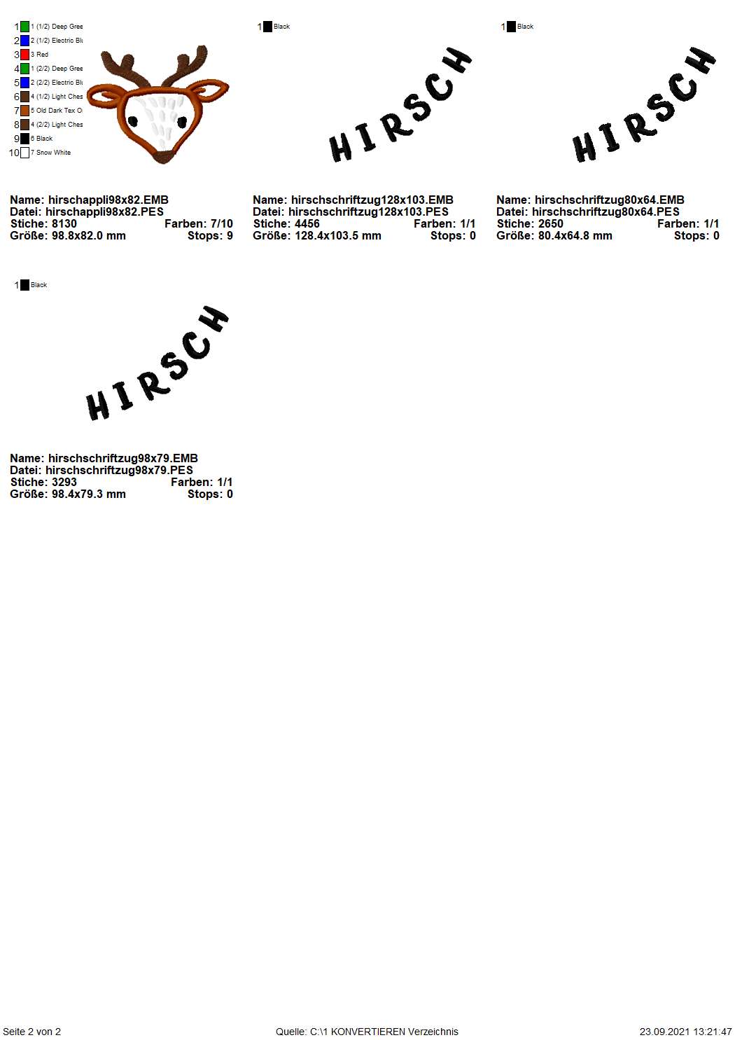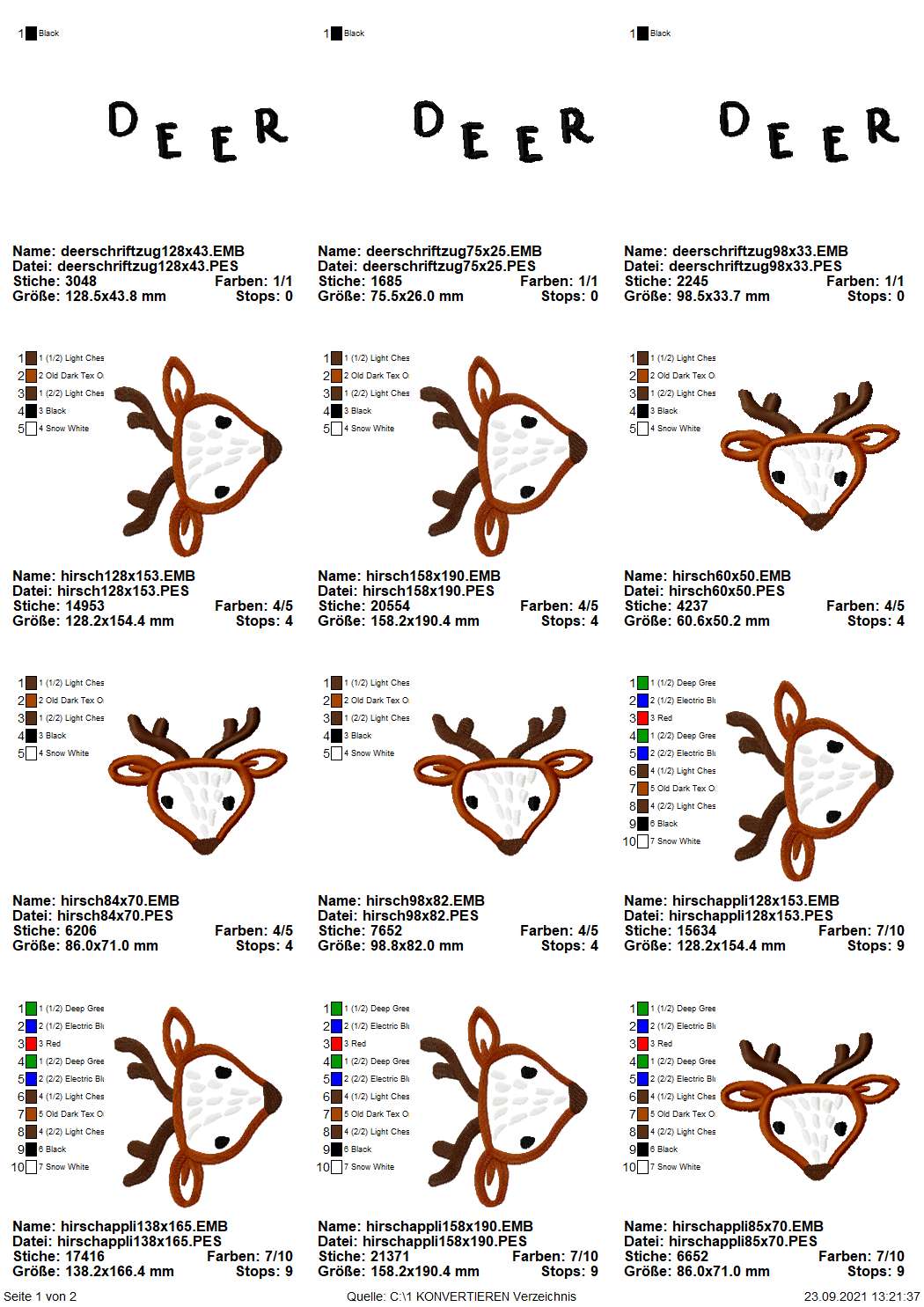 Umfangreiches Stickdatei Set bestehend aus Hirsch Outline-Version in 5 Größen, Hirsch Applikations-Version in 5 Größen, Schriftzug Hirsch in 3 Größen, Schriftzug Deer in 3 Größen. Inklusive Stickübersicht und Werkblätter.