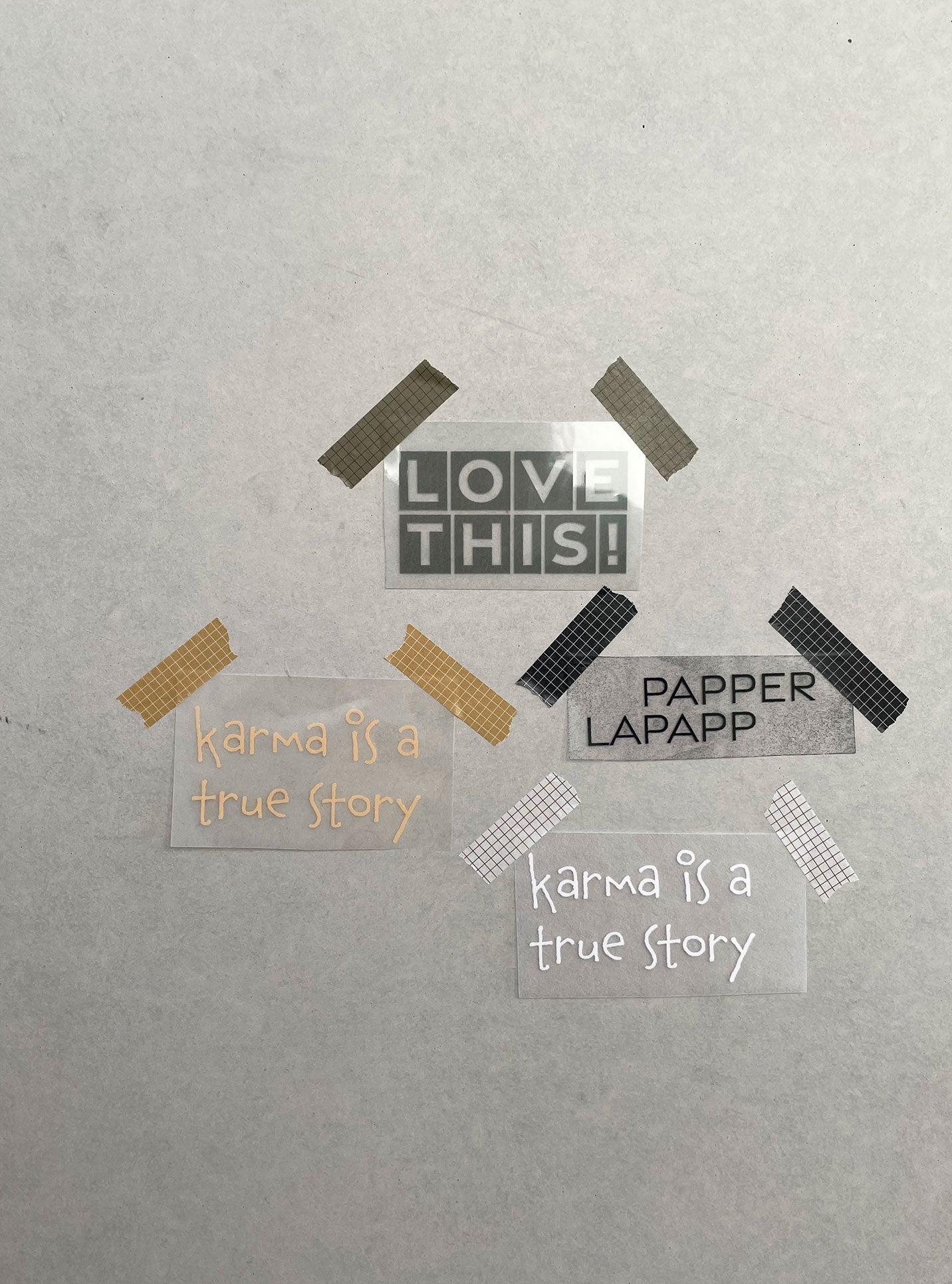 1 Stück flauschiges Bügelbild "Karma is a true story" beige